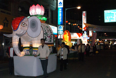 장엄등행렬 코끼리, 잉어, 호랑이, 사슴 등 형형색색의 장엄등 행진.