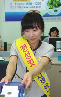 “고객께 친절을 베풀며 일하면서 긍지와 보람을 느낀다”며 “이 자리에서 일할수 있다는 것에 만족한다”고 소박한 꿈을 밝히는 26세의 우체국 직원.