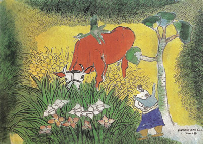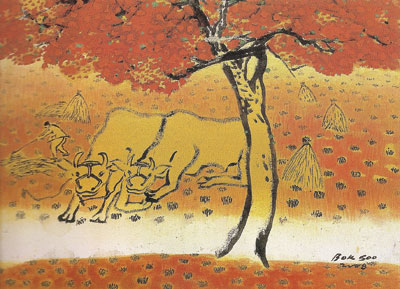 그는 황색, 청색, 백색, 적색, 흑색으로 구성된 오방색의 대조를 통해 소의 역동적인 모습과 한껏 한가로운 모습을 보여줌으로써 인간의 희노애락을 대변하고 있다.
