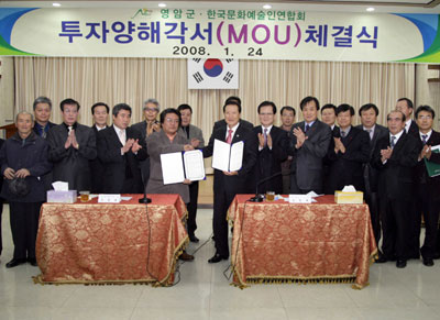 이날 양해각서는 대학 교수, 조각가, 화가, 의사, 시인, 성악가등 전국각지 73명의 회원으로 구성된 사단법인 한국문화예술인 협회가 영암군에서 면적 50만 4천944㎡규모로 450억원(국비200억,지방비250억)의 사업비를 들여 2007~2012년까지 년차적으로 추진중인 영암읍 개신리 소재 바둑테마파크 조성사업지구내 7만㎡ 부지에 사업비 175억원을 투자 60여세대의 전통 한옥전원마을을 조성하는 것이다.