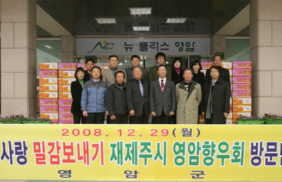 재제주시 영암향우회(회장 윤중호)는 윤중호 회장을 비롯한 회원들이 구랍 29일 영암군을 방문 사랑의 밀감 250(싯가 400만원 상당)박스를 전달했다.
