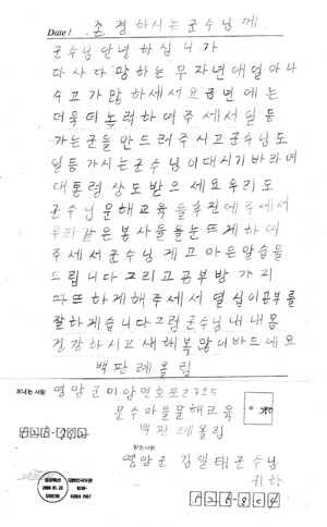 군에 따르면 지난달 22일 미암면 호포리 문수마을 제2기 왕인문해학교 학생 백모씨로부터 편지 한통을 받았다.