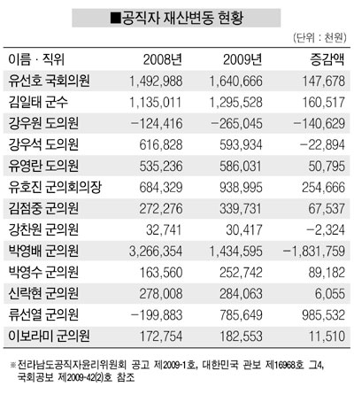 지난달 27일 정부와 국회, 자치단체 공직자윤리위원회가 일제히 공개한 2009년 공직자 재산변동 내역에 따르면 전남에서는 도청 고위직 공무원(5명), 기초단체장(21명), 도의원(50명), 기초의원(243명) 등 재산공개 대상이 319명이었으며, 63%에 달하는 201명이 재산이 늘어난 것으로 나타났다. 이들의 재산 신고시점은 2월 중순으로 알려졌다.