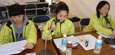 “잠시후 오후 3시부터는 왕인청소년페스티벌 ‘Jump & Dream’이 펼쳐집니다. 왕인청소년페스티벌은 청소년들의 문화적 욕구충족과 끼를 발산할 수 있는 놀이공간을 제공하여 건전한 청소년 놀이문화를 정착시키고…”우리말 멘트에 이어 유창한 발음의 영어 멘트와 일본어 멘트가 차례로 이어진다. 다름아닌 왕인문화축제 주무대 옆 방송진행본부의 방송·통역요원들의 멘트다. 행사 진행에 있어서 없어서는 안될 중요한 축제 도우미들. 화려하게 무대에선 축제 참가자들처럼 크게 주목받지는 못하지만, 축제를 성공적으로 이끌어가는 숨은 공로자들 중 하나다. 노윤희(31·지역경제과), 최지영(28·삼호읍사무소), 우부까따 후미요(41·문화관광과)씨가 그 주인공.이들은 주무대와 왕인박사 유적지 일대에서 펼져지는 각종 행사에 대한 친절한 안내와 설명을 곁들인 외국어 방송멘트로 내국인 축제 관람객과 외국인 관람객들의 편안한 축제관람을 돕는다.이들은 화려한 율동과 연주, 신명난 춤사위가 펼쳐지는 주무대와 가장 가까운 곳에 위치하고 있지만, 정작 무대 뒤편에서 주연을 돕는 보이지않는 조연들이다.모두 군청 직원들로서 우리말과 영어, 일본어 방송멘트와 통역 경력을 지닌 실력파들.특히 일본어방송을 담당한 다문화여성 우부까따 후미요(미암면 거주)씨는 왕인문화축제의 방송·통역 경력만 10년이다. 13년전 한국인 남편과 결혼하면서 영암에 살게된 이후 줄곧 문화광광해설사로 활동하며서 일본어 통역과 영암관광 홍보 일을 해왔다.“기쁨 많아요. 고향분들도 만날수 있고요. 축제홍보 보람도 느껴요”가끔 일어방송이 나간 후 일본인 관람객이 찾아오기도 한다고.