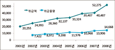 햇사레연합사업단은 지난해 522억 7천500만원의 사업실적을 올렸다. 이중 롯데마트, 상성테스코 등 대형마트의 직거래만도 121억원으로 매출의 23%에 달한다.<그림 참조>