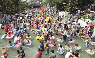 월출산 맥반석에서 흘러나오는 자연수를 이용한 5개의 풀장은 더위를 달래려는 피서객들로 발디딜 틈이 없었다.