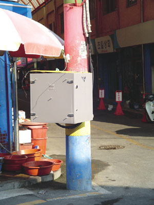 영암읍 동무리 매일시장 입구에 설치된 방법용 CCTV 카메라 박스가 너무 낮게 설치돼 지나가는 사람들이 한눈을 팔 경우 충돌 위험이 있어 위치조정이 요구된다.