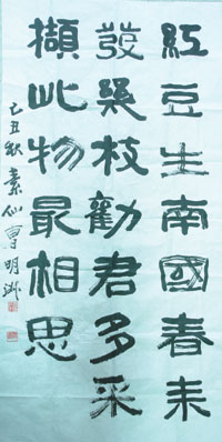 대상의 영예를 차지한 조씨의 작품은 당나라 때 전원(田園)시인 왕유(王維)의 詩 ‘상사(相思)’다. 작품에서 조씨가 구사한 서체는 예서체로서 그중 광개토왕비(서체의 종류)다.