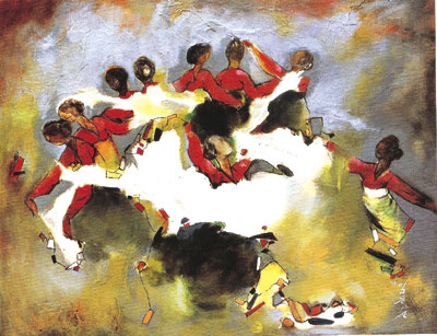 오방색, 춤의 율동, 그 율동을 통해 나오는 기호적 의미가 하나의 하모니를 이뤄 작가의 비범한 예술세계를 펼쳐놓고 손짓한다.