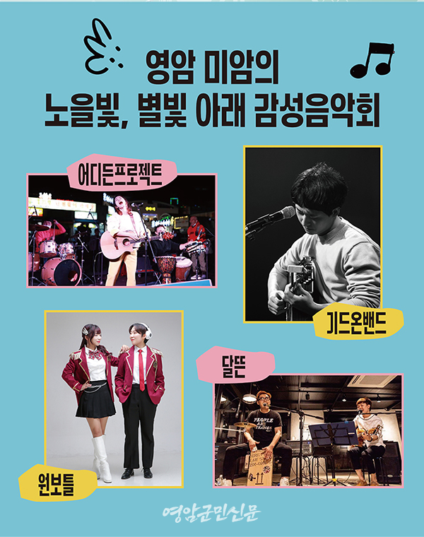 ‘월출산 아래 콘서트’는 2024년 시작된 지역 음악 행사로, 영암의 자연을 무대로 열리고 있다. 이번 행사는 다섯 번째 무대로, 가을 정취 속에서 인디밴드 4팀이 무대를 꾸민다. ‘어디든프로젝트’, ‘원보틀’, ‘달뜬’, ‘기드온밴드’가 참여해 다양한 장르의 음악을 선보인다.