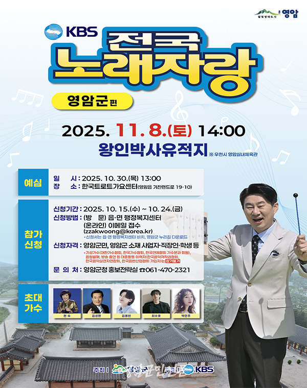 영암군 주최, KBS 주관으로 11/8일 오후 2시 왕인박사유적지에서 열리는 전국노래자랑에서 솜씨를 뽐낼 영암군민 등의 신청을 받는다.