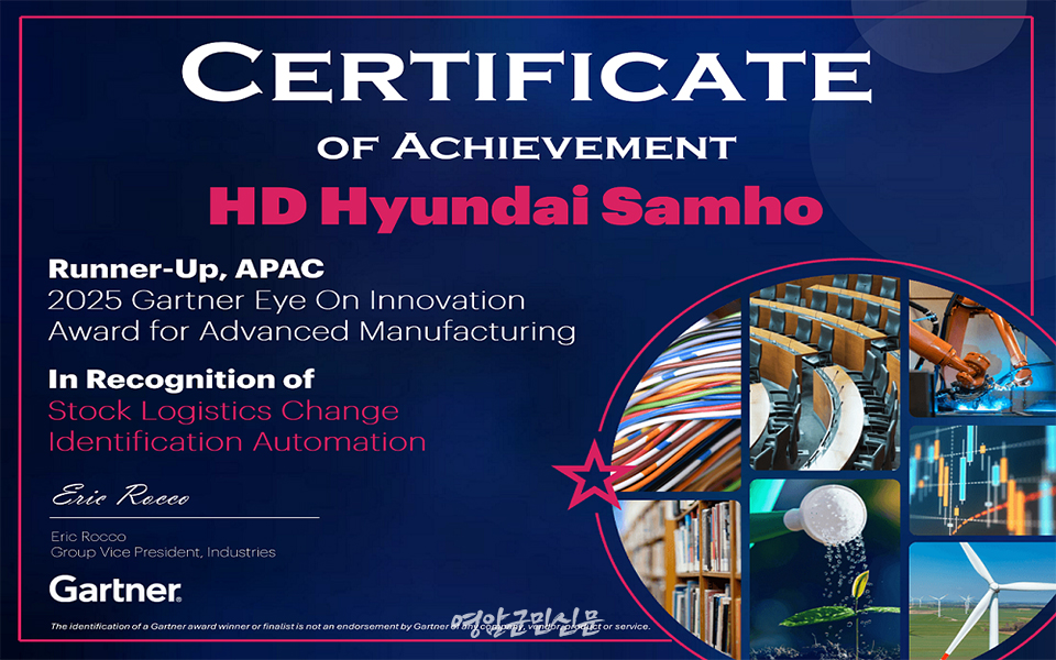 HD현대삼호는 최근 국제 컨설팅 전문 기관 ‘가트너(Gartner)’가 주최한 ‘2025 Gartner EOI(Eye on Innovation) Awards’ 첨단 제조(Advanced Manufacturing) 부문에서 아시아·태평양(APAC) 지역 준우승을 차지해 인증서를 수여받았다고 15일 밝혔다.