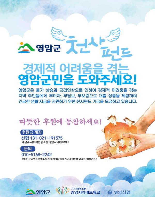 천사펀드는 금융기관의 대출을 받기 어려운 영암군민에게 생활 안정 자금을 무이자·무보증·무담보로 대출해 주는 영암형 사회적 금융이다.