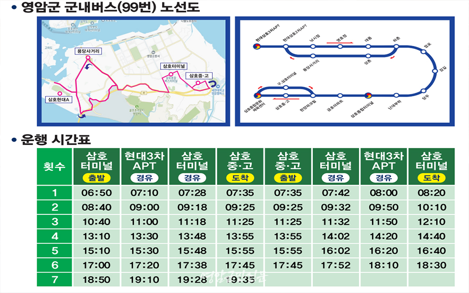주말에도 9회에서 14회로 운행횟수가 늘어나 하당과 삼호읍을 오가는 이들의 이동이 더 수월해질 것으로 기대된다. 목포시 시내버스 노선 일부가 조정되면서 교통 공백이 예상되는 삼호읍 일부 구간에는 영암군이 농어촌버스 99번을 신설한다. 10/31일부터 운행되는 99번은 삼호터미널~현대3차아파트~삼호중·고등학교~삼호종합문화체육센터를 순환하는 형태로 하루 7회 운행된다.