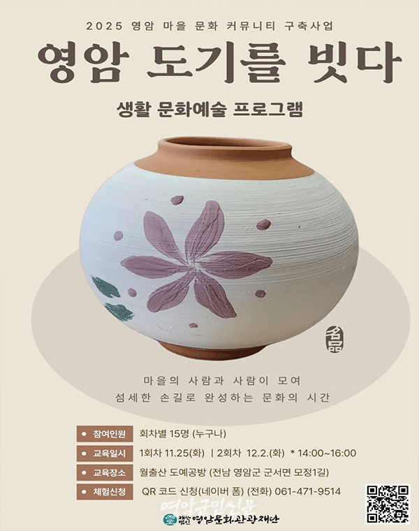 영암문화관광재단 지역문화사업팀 김복음 PD는 “마을 내 공방을 지역의 문화공간으로 활용함으로써 다양한 주민들이 자연스럽게 드나들 수 있는 계기를 만들고자 했다”며 “생활에서 필요한 그릇이나 마을 경관을 아름답게 꾸밀 꽃 화분을 직접 만들며 주민 간 커뮤니티를 형성하는 의미 있는 시간이 될 것”이라고 말했다.