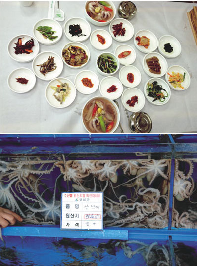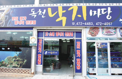 신안과 압해도에서 잡은 뻘낙지만을 고집하는 곳, 화학조미료를 사용하지 않고 토종 양념만을 사용하는 곳, 연포탕에서부터 낙지구이까지 전체 메뉴에 뻘낙지만을 사용하는 곳. 독천 농협사거리에 있는 ‘독천 낙지 마당’이다.