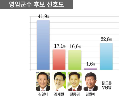 영암군민신문이 31일 한국갤럽에 의뢰해 지역유권자 1,004명을 대상으로 군수후보 선호도 여론조사를 실시한 결과 김일태 군수가 41.9%로 선두를 달리고 있고, 김재원 전남지사 정책보좌관이 17.1%로 2위, 전동평 전 도의원이 16.6%로 바짝 뒤따르고 있는 것으로 나타났다.<표 참조>