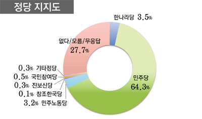 정당 선호도에서는 민주당이 64.3%로 앞선 가운데 지지정당이 없다, 잘 모른다는 응답이 27.7%나 됐다. 한나라당이 3.5%, 민주노동당이 3.3%로 나타났다.