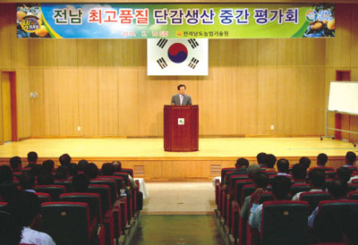 이번에는 전남지역 단감 탑프루트 생산단지인 영암, 담양, 장성, 구례, 순천, 해남단지 회원 150여명이 지난 16일 영암군농업기술센터와 인근 시범단지 회원 과원에서 전반기 단감 탑프루트 시범사업의 중간진도관리 점검과 단감과원의 적과 및 하기유인 등 수체관리와 감나무 깍지벌레 등 초기 병해충 방제 교육을 실시했다.