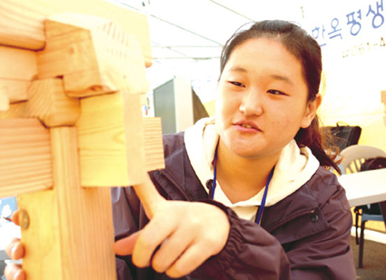 제1회 한옥건축박람회에 목재조립체험관 해설 도우미로 나선 서로사(23·전주우석대 4년) 학생은 “이렇게 한옥박람회라는 큰 행사에 참여함으로써 좋은 경험을 쌓게되어 기쁘다”며 행복한 표정이다.