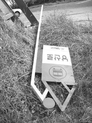 KS규격에 맞지도 않는 자재로 저를 만드셨고요, 또 제 다리를 깊이 묻지도 않았답니다. 또 이렇게 쓰러진 채 10여일째 누워있는데도 저를 세워주질 않네요. 참 양심없는 사람입니다. -표지판-