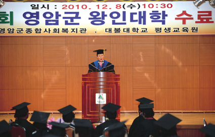 이날 수료식에서는 영암읍 춘양리 천만임씨(82 최고령 수료자) 등 100여명의 수료생에게 영암군 왕인대학장의 수료증이 수여되었으며, 1년 동안 개근한 덕진면 김용석씨 등 5명의 왕인대학생에게 대불대 안종기 평생교육원장의 개근상 시상도 이루어졌다.
