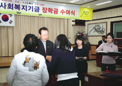 군에 따르면 이날 장학금은 군 사회복지기금으로 조성, 국민기초생활보장수급자와 차상위계층 자녀를 대상으로 읍면장의 추천을 받아 기준에 적합한 성적우수자 및 예체능특기자에게 지급한 것으로, 지난 97년부터 올해까지 모두 300여명의 학생들을 선발, 총 1억2천여만원의 장학금을 지급해오고 있다.