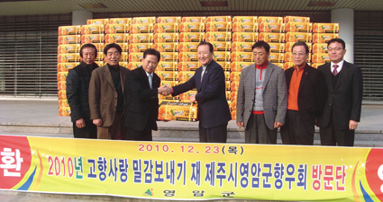 재제주시 영암군향우회(회장 김문옥)는 지난 23일 고향을 찾아 사랑의 밀감 200여박스를 전달했다. 이날 고향을 방문한 김문옥 회장 일행은 성탄절과 연말연시를 맞아 주위의 어려운 이웃에게 따뜻한 사랑의 손길을 보내고 고향사랑 실천운동을 전개했다. 김 회장은 “고향의 어려운 분들에게 따뜻하고 건강한 성탄절과 연말연시가 되었으면 좋겠다”고 말했다.