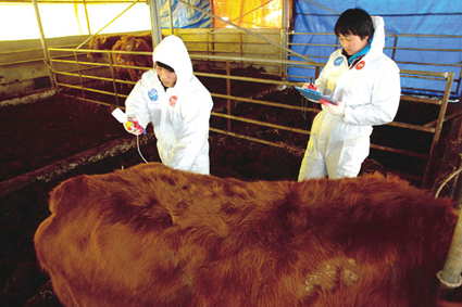 지난 16일부터 시작된 영암군내 가축에 대한 구제역 예방백신 접종이 25일 마무리됐다. 영암군은 소 4만2천360두, 돼지 3만3천두에 대해 백신을 접종했다. 25일 도포면 덕화리 한 축산농가에서 매력한우 백신접종팀이 이 농가 소 21두에 백신을 접종하고 있다.