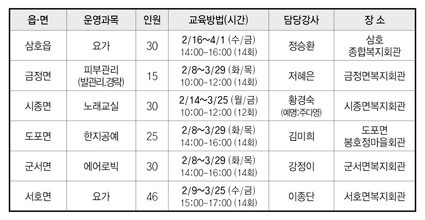 종합사회복지관은 이를 위해 삼호읍을 비롯한 5개 면의 여성들을 대상으로 실제 여성들의 희망률이 높은 프로그램인 요가, 에어로빅 등 총 6개 과정으로 구성된 교육을 2월 8일부터 4월 1일까지 2개월간 읍면사회복지관에서 주 2회 2시간씩 진행하기로 했다.