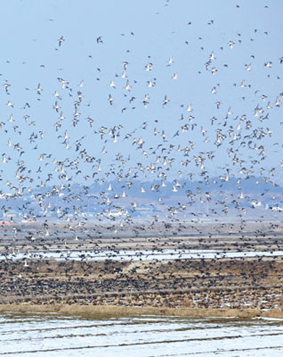 설 연휴인 지난 5일 군서면 성양리 들녘에 수십만마리의 겨울 철새들이 날아들어 장관을 이루고 있다. 그러나 구제역과 AI방역활동이 한창인 영암지역에 철새들의 출현은 그리 반갑지만은 않다 /영암군청 강평기