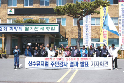 한편 산수뮤지컬 저지 군민대책위는 이날 군청 앞에서 기자회견을 갖고 군민에 대한 사과와 산수뮤지컬사업의 중단을 요구했다. 특히 “이번 감사결과에 전남도의 관련 부서 직원들에 대한 책임이 포함되지 않은 것은 결코 공정하다고 볼 수 없다”며 전남도와 문화관광부의 책임론도 거론했다.