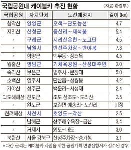 환경부에 따르면 지금까지 15개 지방자치단체가 9개 국립공원 안에 15개의 케이블카 설치를 추진 중이다.<표 참조>