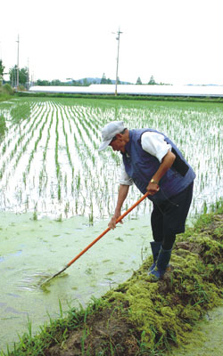 지난 22일부터 내린 비로 영암지역에 23일 오전 8시 현재 48.4mm의 강우량을 보이며 농작물 해갈에 반가운 단비가 됐다. 23일 이른아침 금정면 용흥리 들녘에서 한 농부가 논에 뜬 물이끼를 걷어내고 있다. 기상청은 25일부터 더 많은 비가 내릴 것으로 예상하고 비 피해가 없도록 대비할 것을 당부했다.
