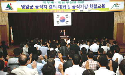 이날 결의대회를 통해 김일태 군수는 “최일선의 공직자들이 부패로 멍들어 있다면 주민들은 도대체 누굴 믿고 이 나라에 애정을 쏟겠느냐 우리 군에는 없겠지만 만약 비리 공직자들이 있다면 이유여하를 묻지 않고 강력하게 대처할 것”이라고 말했다.