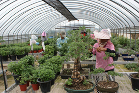 국화축제에서 가장 화려한 볼거리가 될 모형작품과 다륜작, 현수막, 입국, 분재국, 옥국 등의 국화 분화 작품들은 농업기술센터에서 직접 생산되고 있다. 아예 가위를 들고 직접 현장에서 지도감독하고 있는 김상호 담당 몫이기도 하다. 여기에는 군민 7명이 일용직 근무형태로 국화 분화 작품 제작에 매달리고 있다. 오랜 경험 때문에 거의 전문가 수준이라는 것이 정 담당의 귀띔이다.