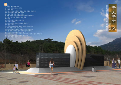 왕인공원의 ‘랜드마크’로 조성될 ‘천인 천자문’ 조형물은 한국과 중국, 일본의 명사 1000명이 각자 한 글자씩 천자문을 썼고 영암 석공이 이를 돌에 새겨 만든 것이다. 이는 1600여년 전 천자문을 비롯해 백제의 선진문물을 일본에 전해 고대 아스카문화를 꽃피우게 한 영암 출신 왕인 박사의 업적을 기리기 위한 것이다.