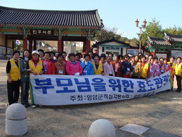 이날 효도관광에서 대한적십자사 영암봉사회원들은 정성어린 음식과 선물을 마련해 내 부모님처럼 어르신들을 대접함은 물론 혼자서는 선뜻 나서기 힘든 가을 나들이를 통해 어르신들께 즐거움을 선사했다.