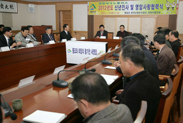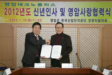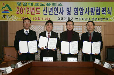 경영자協, 영암사랑상품권 10년간 4억원 구입 약정 경영자協, 군민장학기금 10년간 3천만원 기탁 협약 선보하이텍, 대상重 등은 장학기금 500만원씩 기탁 영암군과 영암테크노폴리스(대불산업단지) 입주업체들이 신년인사회를 겸해 ‘영암사랑협력’을 맺고 서로 상생협력하는 ‘윈-윈 관계’ 정립에 나서 주목을 끌고 있다.특히 이날 협력식에서는 입주업체들 가운데 구내식당을 운영하는 기업들은 영암쌀을 우선 구매해 사용하는 협약을 맺었는가 하면 영암사랑 상품권 구입 약정식도 체결해 지역경제 활성화에 직접 기여하는 일부터 솔선하고 나섰다.또 현대삼호중공업협력사 협의회를 비롯한 입주업체들이 잇따라 2천여만원의 군민장학기금을 기탁하는 등 지역인재양성에도 동참하고 나섰으며, 군은 이에 화답해 기업체들의 경영애로사항에 대해 적극적인 해결에 나서기로 했다. 군은 지난 10일 오전 군청 낭산실에서 영암테크노폴리스와 2012년 신년인사 및 영암사랑협약식을 가졌다.이날 협약식에는 김일태 군수와 정광덕 부군수를 비롯한 실·과장과 한국산업단지공단 대불지사 조성태 지사장, 영암테크노폴리스경영자협의회 고창회 회장(대아산업 회장), 박인수(경인엔지니어링 회장)·유동윤(반도호이스트크레인 대표) 부회장, 정환송(동신공업 사장) 감사, 황남석(금강중공업 사장) 총무이사, 신용환 현대삼호중공업 제2공장 부장, 문제균 대상중공업 사장, 임영삼 선보하이텍 이사, 유인숙 유일 사장, 정태형 정오엔지니어링 대표 등이 참석했다.신년하례에 이어 열린 영암사랑협력식은 군과 영암군농협통합RPC(대표 박석주), 영암테크노폴리스경영자협의회, 한국산업단지공단 대불지사가 영암쌀 이용 협약을 체결하는 것으로 시작됐다.이들은 이 협약을 통해 영암테크노폴리스 입주업체 가운데 구내식당을 운영하는 77개 업체가 영암쌀을 최우선 구입하기로 약속했다.이어 군은 영암테크노폴리스경영자협의회와 영암사랑 상품권 구입 약정식을 체결하기도 했다. 이에 따라 경영자협회는 매년 설 명절과 추석 명절에 2천만원씩 연간 4천만원 상당의 영암사랑 상품권을 구입하는 등 앞으로 10년 동안 4억원 상당의 영암사랑 상품권을 구입하게 된다.이어 열린 영암군민장학기금 기탁식에서는 경영자협의회가 향후 10년간 3천만원을 기탁하기로 협약을 맺었다. 또 대아산업 고창회 회장과 현대삼호중공업협력사 협의회, 선보하이텍, 대상중공업 등은 즉석에서 각각 500만원씩의 장학기금을 기탁했다.김 군수는 이날 협력식에서 인사말을 통해 “영암뿐 아니라 전남 서남부권 경제의 심장역할을 하고 있는 영암테크노폴리스 입주업체들과 신년인사회를 겸한 영암사랑협력식을 체결하게 돼 뜻깊다”면서 “입주업체들의 정성을 생각해서라도 인재의 육성과 발굴에 더욱 매진하겠다”고 밝혔다.김 군수는 특히 “영암테크노폴리스 입주업체들의 영암사랑에서 큰 활기와 희망을 보았다”면서 “기업활동에 어려움이 있다면 언제라도 영암군이 나서서 해결하는 등 임진년 한 해 군과 영암테크노폴리스 입주기업들이 윈-윈하는 원년이 되었으면 한다”고 강조했다.영암테크노폴리스경영자협의회 고창회 회장도 인사말을 통해 “대불산단 진입도로 조기개통으로 입주기업들의 물류비 절감에 큰 도움을 주었고, 입주기업 방문을 통해 영암군과 협력할 수 있는 길을 열어준 김일태 군수와 공직자들에 감사한다”면서 “영암테크노폴리스경영자협의회는 올해 최대 역점을 조선업종에 치우친 대불산단의 사업 다각화에 두고 있으며 성공하리라고 확신한다”고 말했다.