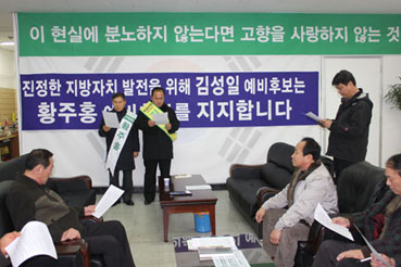 김 후보는 또 “우리는 모든 분야에서 뒷걸음질만 치고 있다. 특히 여의도로 상징되는 중앙정치는 썩을 대로 썩었다”면서 “국민이 주인이 되는 정치를 위해 군림하지 않고 오직 국민을 위해 봉사하는 정치인, 능력과 도덕성을 겸비한 사람이 국회에 들어가야 한다”며 “황 후보가 그에 적합한 인물”이라고 주장했다.