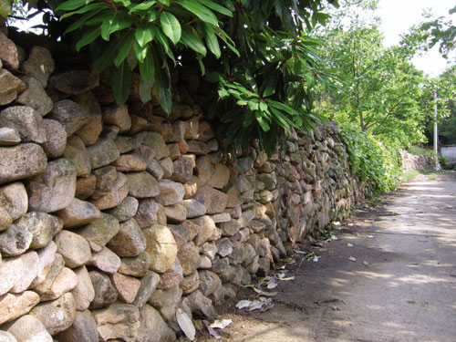 죽정마을 담장은 흙 채움이 없이 돌로만 쌓은 강담구조로써 산기슭과 하천의 자연석을 이용하여 쌓았으며, 또한 가옥의 벽체, 하천 제방과 옛 돌담이 잘 조화되어 우리의 전통 마을경관을 잘 연출하고 있다.