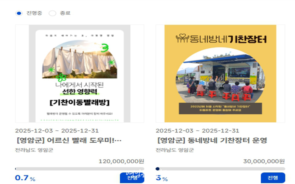 | 영암군, 이동 빨래방·장터 운영비 지원 모금 추진 고향사랑 지정기부 추진 영암군민신문 yanews@hanmail.net |