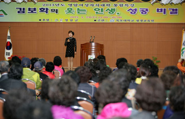 ‘김보화의 웃는 인생 성공비결’이라는 주제로 2시간 동안 열린 특강에서 김보화씨는 수년간 개그우먼으로 활동하면서 겪었던 에피소드를 바탕으로 “웃는 인생을 살아야 행복한 삶을 살 수 있다”는 메시지를 전달했다. 또 개그우먼 특유의 재치 있는 입담으로 특강에 참석한 300여명의 여성자치대학생과 영암군민들에게 큰 재미를 선사했다.