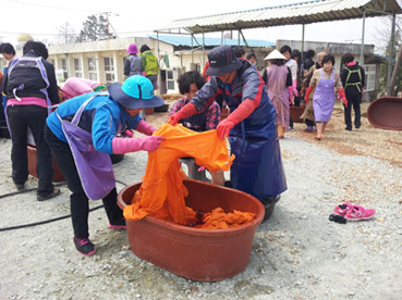 이날 천연염색 프로그램 체험에 나선 학산면 생활개선회 회원들은 기본교육을 마친 후 염색에 나서 황화와 밤을 재료로 찬란한 황색과 갈색의 이불보를 연출해냈고 원재료에 따라 각자가 원하는 색상을 얻기도 했다.