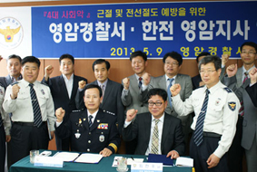 영암경찰서(서장 김영달 총경)는 지난 5월9일 영암경찰서 2층 소회의실에서 한전 영암지사(지사장 임한우)와 4대 사회악 근절을 위한 홍보 및 전선도난 예방 등 신속대응을 위해 업무협약을 체결했다.