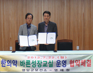 이날 협약식은 한의약 건강증진사업을 효율적으로 운영해 학생들의 건강증진을 꾀하자는 취지에서 마련됐으며, 이두섭 보건소장과 영애원 조규연 원장은 협약이 성공적으로 이뤄질 수 있도록 노력할 것을 다짐했다.