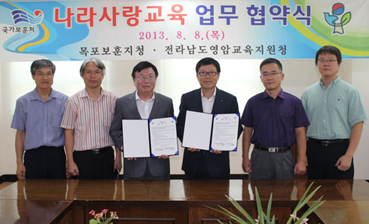 목포보훈지청(지청장 이명재)과 영암교육지원청(교육장 장동연)은 지난 8월8일 목포보훈지청 회의실에서 ‘나라사랑 교육 업무협약식’을 체결했다.