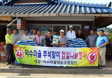 올해로 8년째 실시하고 있는 ‘사랑의 햅쌀 나눔행사’가 그것으로, 이 행사는 덕수마을에 거주하는 백흥운(86)옹이 마을에 기증한 1천750평의 논이 계기가 되어 덕수마을영농조합법인(대표 최영만) 회원들이 경작해 수확한 햅쌀을 마을의 어려운 주민들에게 전달하고 있다.