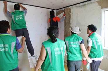 특히 가정형편이 어렵고 홀로사는 주택 2세대를 선정해 장판을 교체하고, 곰팡이로 얼룩진 방에 도배작업을 새로했다. 또 여름 동안 지친 어르신들의 건강을 체크하고 집안 구석구석을 청소하는 등 구슬땀을 흘렸다.