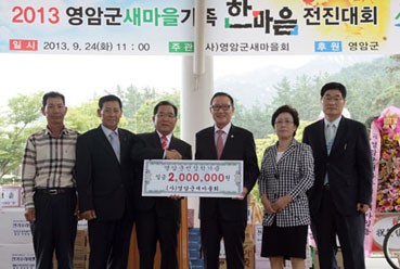 영암군의 후원으로 ‘나눔, 봉사, 배려로 더불어 사는 제2 새마을운동 실천’을 위해 열린 이날 새마을가족 한마음 전진대회에서는 행사에 앞서 (사)영암군새마을회가 알뜰 나눔장터 운영 수익금 200만원, 도포면 남여 새마을지도자 협의회가 100만원을 각각 지역 인재육성에 써 달라며 영암군민장학회에 기탁했다.